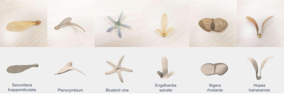 信息研究院2021级本科生卜佳木回忆说:“我们在收集高质量翅果时费了不少功夫。网店上的种子通常以播种为目的,绝大部分的形态都不完整导致无法进行研究。后来,我们了解到云南西双版纳翅果资源较为丰富,在网上联系到一些当地供货商买到了需要的翅果样本。”随后,研究组利用清华大学基础工业训练中心提供的手持式三维扫描仪对每一颗翅果进行了三维数字重建,经过处理后形成了包含55枚种子三维样本的数据集。这些种子横跨14个物种,保证形态的多样性。