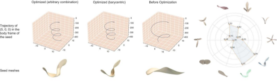 为检验方法的有效性,研究者分别对比了自然翅果和优化后人造翅果在自旋速度、下落速度、飞行距离及飞行轨迹方面的表现。