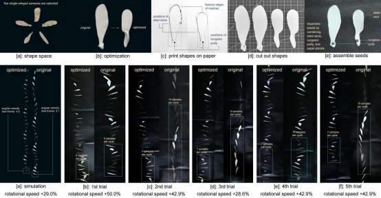 自旋速度对翅果传播有重要影响。旋起来的翅果像竹蜻蜓或螺旋桨,转速越高产生的升力越强,种子在空中停留的时间就越长,也就更有可能传播至更远的地方。研究组不仅在仿真器中进行了转速实验,也使用常见材料制作了优化前后的翅果实物模型,检验它们在空气中的真实性能。在仿真实验中,优化后的翅果转速提升了约29%。而在五次空气中的飞行测试中,优化后的翅果转速提升了27.6%到50%。