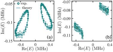 段路明教授研究组基于单个171Yb+离子实现了双能带非厄米模型,其复数本征能量具有unlink、unknot或Hopf link拓扑结构。该模型的厄米部分由微波脉冲驱动基态超精细能级间的跃迁来实现(图1a MW-1, MW-2; 图1b黑色双箭头),而非厄米部分则通过用共振激光使离子从基态跃迁至激发态(图1a 369-1, 369-2; 图1b 蓝色箭头),激发态自发辐射导致布居流失实现了非厄米部分(图1b波浪线)。为测量系统的复数能量,基于非厄米吸收光谱学方法,研究人员将离子制备在2D3/2能级(辅助能级)上,然后通过弱激光将其与系统能级相耦合(图1a 435; 图1b 黄色箭头),并在经过长时间后,测量离子处于辅助能级的概率。通过拟合测量到离子的概率与失谐的曲线,可以提取出非厄米系统的复数能量。实验测量得到的复数能量呈现出unlink、unknot或Hopf link的拓扑结构(图2, 图3),且实验测量值与理论值符合得很好。此方法可以直接推广到其它量子模拟平台,如冷原子、超导电路或固态自旋系统,因此本实验为探索非厄米量子系统中各种复数能量性质开辟了一条道路。