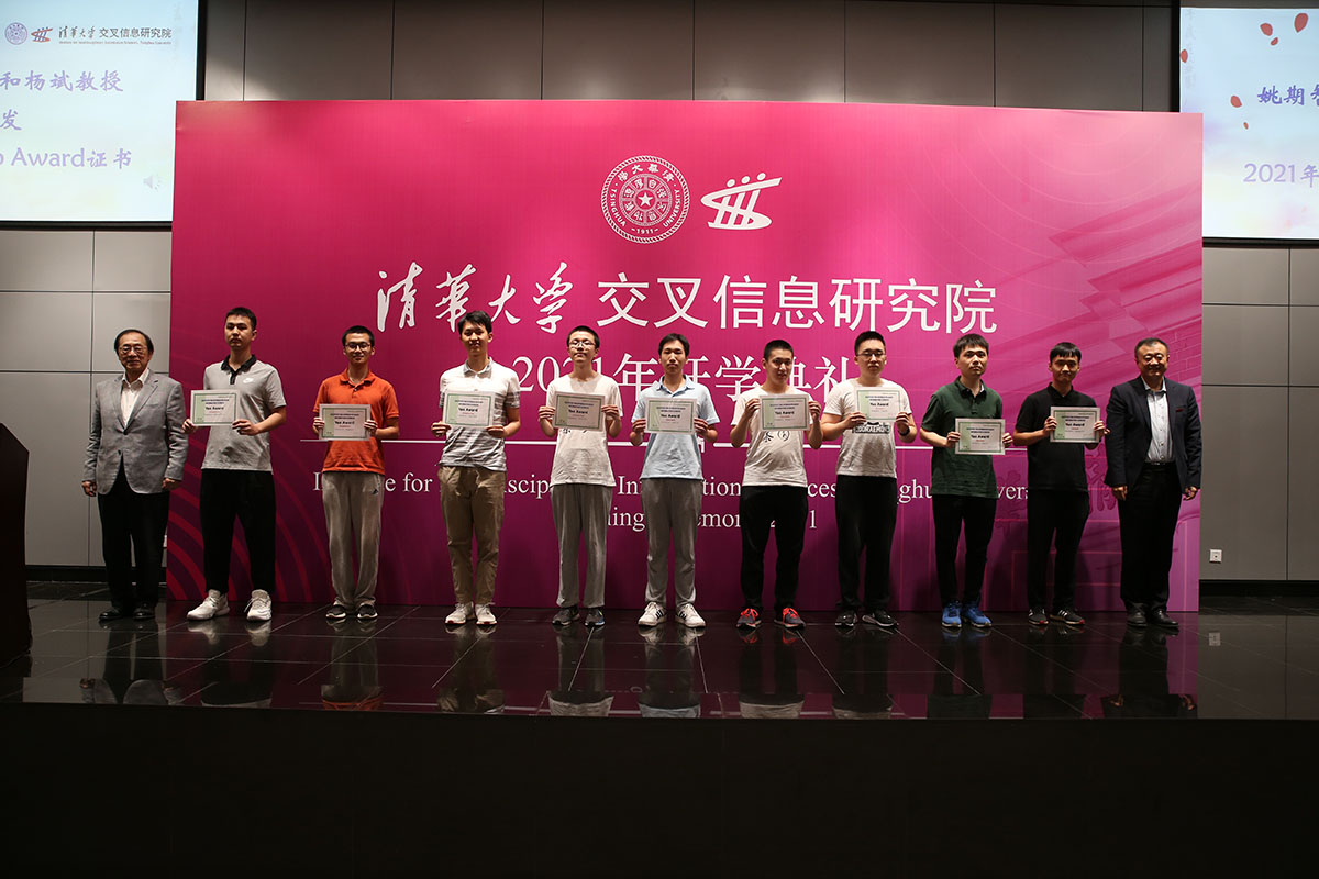 典礼上,姚期智院士和杨斌教授共同颁发了2021年度Yao Award奖学金。本年度共有12名本科生获得这项荣誉。获奖代表计科81班武弘勋同学分享了院内的高质量课程、优秀师资以及科研环境对自己的巨大帮助;他鼓励新生们充分利用飞球直播