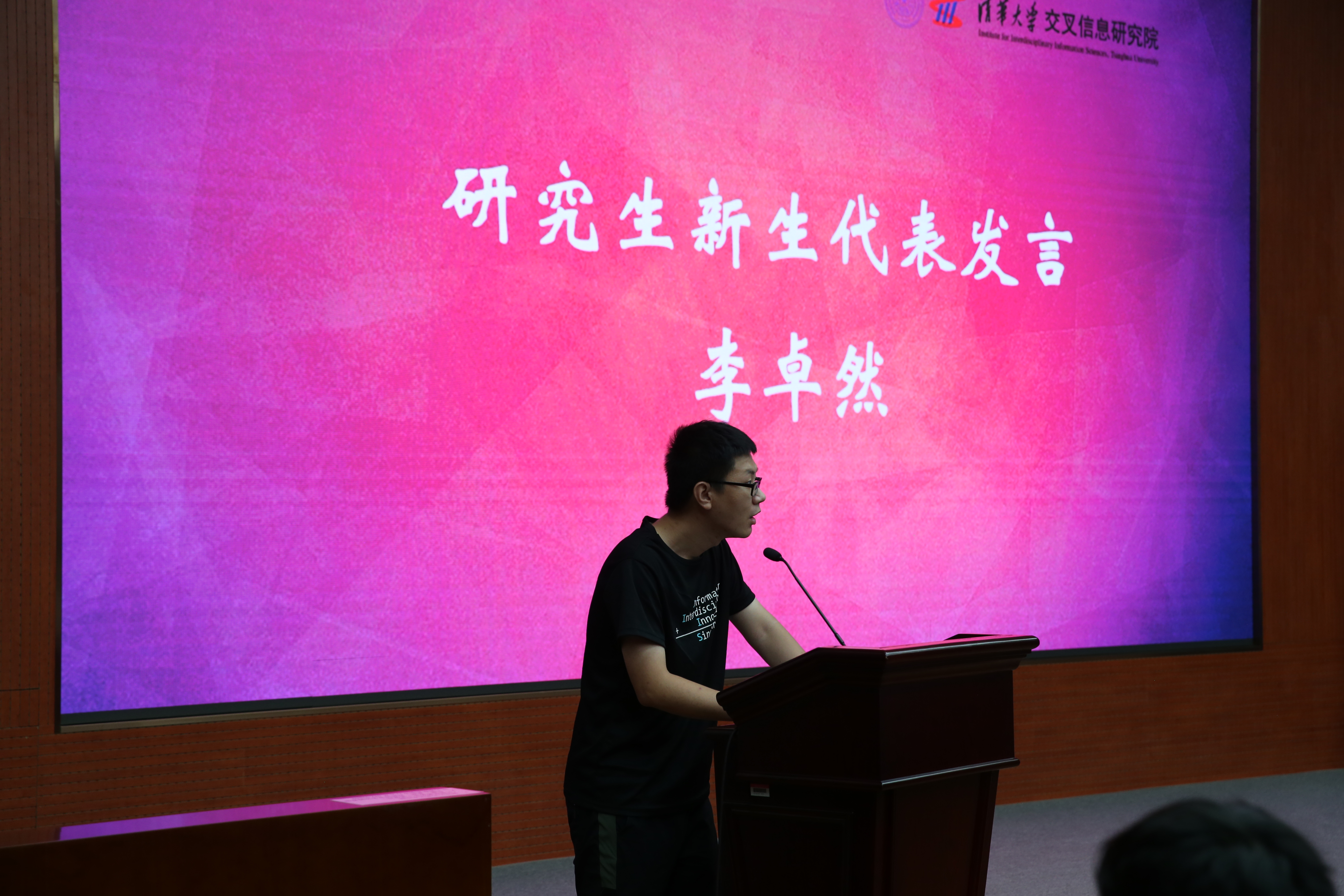李卓然代表全体研究生新生发言。他表示,在国际国内形势复杂的今天,更应该坚定科研报国的志向,努力在关键领域实现突破,努力在卡脖子技术上实现长足的时间积累与沉淀,希望与所有同学一起在计算机科学与物理学的各个分支领域披荆斩棘、乘风破浪。