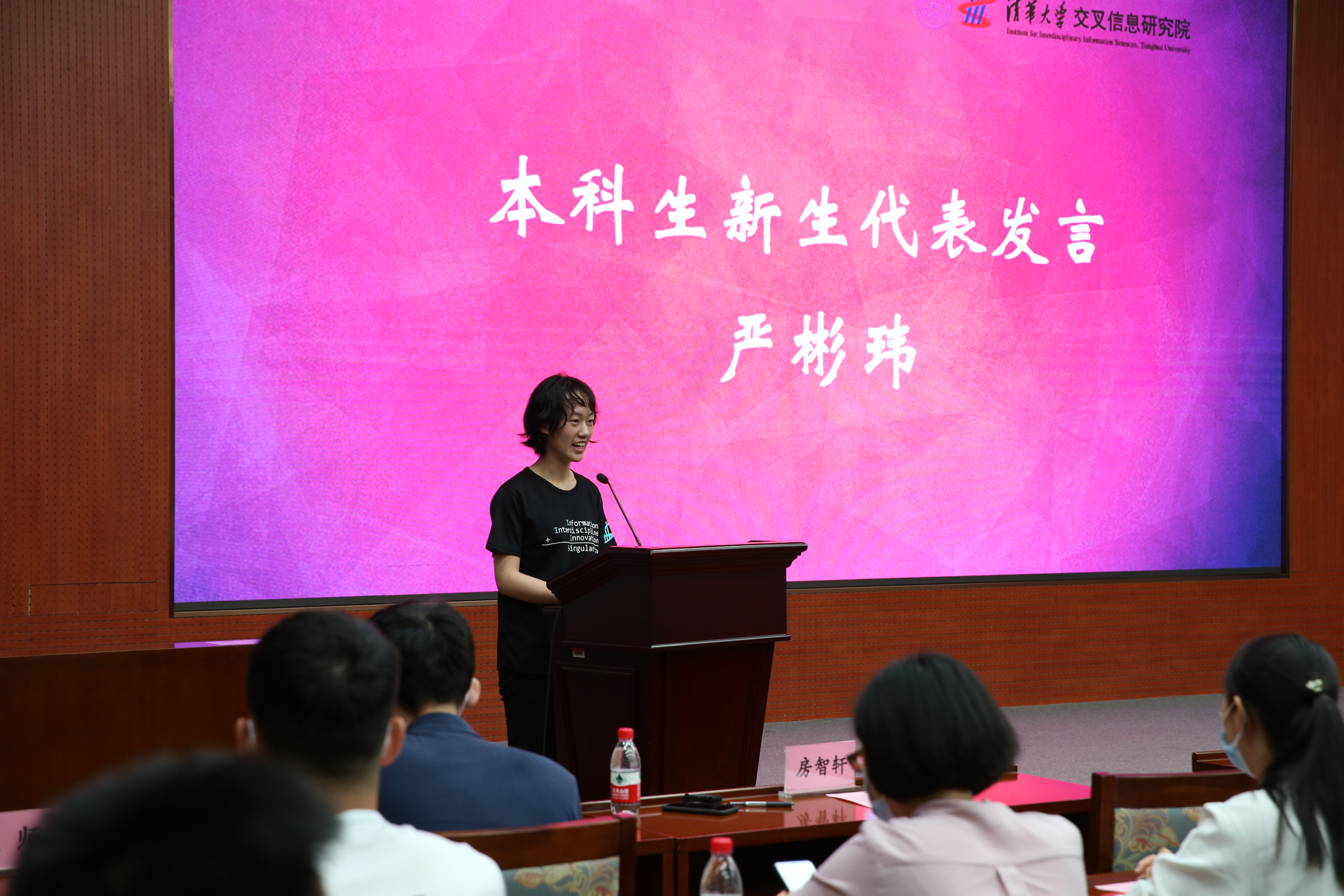 严彬玮代表全体本科生新生发言,感谢老师们和辅导员们对新生的关怀和陪伴。作为数学竞赛生,严彬玮交流了自己对于数学和基础理论研究的热爱。她表示非常幸运能进入飞球直播