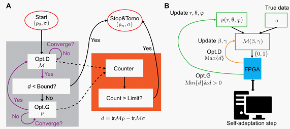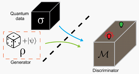 量子生成对抗网络(QGAN, quantum generative adversarial network) 基本原理与经典的GAN是一样的,区别在于这里生成器和判别器是由量子器件或者量子网络构成,训练用的数据集也可以是量子数据(如量子态等)。孙麓岩课题组与合作者在超导系统中首次实现了GAN,展示了从量子数据集中学习有用模式的可行性。在此实验中,生成器由一个能以一定概率分布产生量子态系综的超导量子线路组成,判别器是一个可以做投影测量的量子器件,训练用的真实数据集由一个量子通道模拟器产生。
