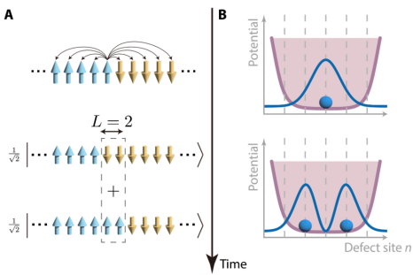 本工作中,研究人员通过对各个离子量子比特的单独寻址操控,在20个离子的一维离子链上制备了单个自旋扭结的初态。研究人员进而利用长程相互作用的横场伊辛模型实现平缓的自旋扭结有效势场,观察到自旋扭结在动力学演化过程中由于量子干涉效应分裂成位于不同位置的叠加态。