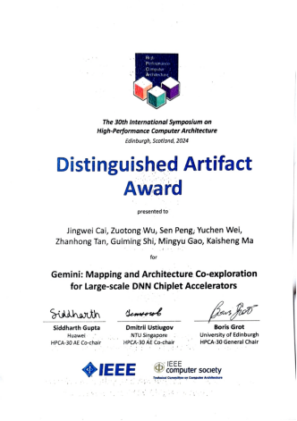 马恺声研究组与高鸣宇研究组联合发表的科研成果Gemini: Mapping and Architecture Co-exploration for Large-scale DNN Chiplet Accelerators荣获会议Distinguished Artifact Award。