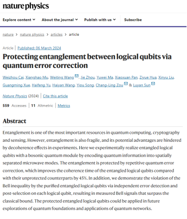 信息研究院孙麓岩研究组与中国科学技术大学邹长铃研究组、北京量子信息科学研究院于海峰团队合作,在超导量子系统中实现了对逻辑量子比特之间量子纠缠的量子纠错保护。该成果论文以“Protecting entanglement between logical qubits via quantum error correction”为题,于2024年3月6日在Nature Physics(《自然•物理》)杂志在线发表。