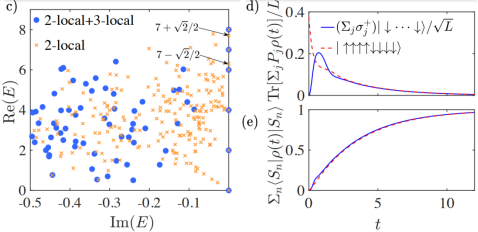 图2:以量子多体伤痕态为无耗散子空间的刘维尔超算符的能谱以及耗散动力学