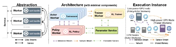 吴翼研究组在强化学习训练系统抽象层面提出了创新设计方案,自主设计并开发了能够部署在一万个计算核心上进行强化学习的分布式系统SRL。通过创新的数据流抽象和高效的架构设计,在多个核心上实现了可扩展、高效和可扩展的强化学习训练,显著提高了训练吞吐量和学习性能。本系统吞吐量和样本效率能够达到最佳开源系统的21倍,达到OpenAI闭源系统的5倍。