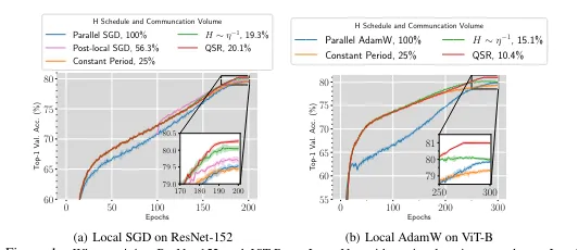 张景昭研究组和黄隆波研究组研究了分布式深度学习中的数据并行训练问题, 提出了Quadratic Synchronization Rule(QSR)的新方法,不仅考虑了通信成本和优化速度之间的权衡,而且还考虑了同步周期H对模型泛化能力的影响,在减少通信量和提高测试准确率方面的显著效果。