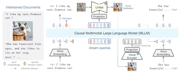 弋力研究组提出了多模态大型语言学习框架DREAMLLM,首次实现了兼具多模态内容创作和理解的功能且相互促进的通用多模态大模型,并且是第一个原始数据级的完全自回归多模态大模型。该工作由弋力研究组与清华大学马恺声老师研究组合作完成。