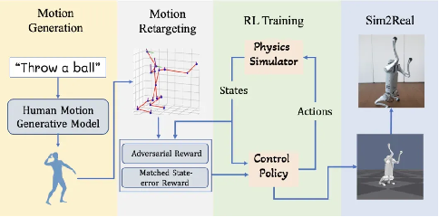 吴翼团队在四足机器人执行类人双足运动研究中取得重要进展,在ICRA 2024上发表2项成果。提出了一个分层框架,能够响应人类视频或自然语言指令,实现模仿拳击、芭蕾舞等动作,并与人类进行物理互动。提出了LAGOON系统,它使用预训练模型生成人类动作,然后通过强化学习在模拟环境中训练控制策略,以模仿生成的人类动作,并通过领域随机化将学习到的策略部署到真实世界的四足机器人上,实现了如“后空翻”、“踢球”等复杂行为。