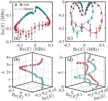 段路明教授研究组基于单个171Yb+离子实现了双能带非厄米模型,其复数本征能量具有unlink、unknot或Hopf link拓扑结构。该模型的厄米部分由微波脉冲驱动基态超精细能级间的跃迁来实现(图1a MW-1, MW-2; 图1b黑色双箭头),而非厄米部分则通过用共振激光使离子从基态跃迁至激发态(图1a 369-1, 369-2; 图1b 蓝色箭头),激发态自发辐射导致布居流失实现了非厄米部分(图1b波浪线)。为测量系统的复数能量,基于非厄米吸收光谱学方法,研究人员将离子制备在2D3/2能级(辅助能级)上,然后通过弱激光将其与系统能级相耦合(图1a 435; 图1b 黄色箭头),并在经过长时间后,测量离子处于辅助能级的概率。通过拟合测量到离子的概率与失谐的曲线,可以提取出非厄米系统的复数能量。实验测量得到的复数能量呈现出unlink、unknot或Hopf link的拓扑结构(图2, 图3),且实验测量值与理论值符合得很好。此方法可以直接推广到其它量子模拟平台,如冷原子、超导电路或固态自旋系统,因此本实验为探索非厄米量子系统中各种复数能量性质开辟了一条道路。