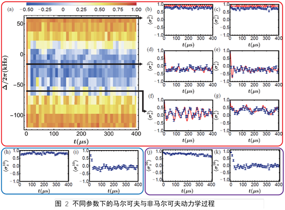 本实验中,研究人员通过精密操控激光以及离子间的库仑相互作用形成的声子交换项,实现了杰恩斯-卡明斯-哈伯德模型的可控量子模拟研究。由于该模型具有总激发数守恒的特点,可通过制备不同的总激发数来控制系统的有效空间维度。研究人员在小规模系统(2、4、8离子)和低总激发数的大规模系统(20、32离子)中观察到了符合理论预期的自旋动力学演化,从而验证了模型的成功实现。通过调节模型中的参数,研究人员实现了系统演化从马尔可夫动力学过程到非马尔可夫动力学过程的变化,并进一步通过调节离子数和总激发数在大规模系统观测到了非马尔可夫动力学特征。在32离子和32个总激发数的情况下,实验系统的有效态空间维度高达2的77次方(1.5千万亿亿),远超经典超算的直接模拟能力。该实验展示了利用离子量子模拟器研究量子多体系统及开放量子系统的优势。