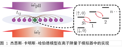 杰恩斯-卡明斯-哈伯德模型由量子光学和凝聚态物理中的两个基本模型结合而成,即描述原子与光场相互作用的杰恩斯-卡明斯模型以及描述晶格中粒子相互作用的哈伯德模型。该模型包含了局域的自旋-声子相互作用以及长程的声子-声子相互作用,同时具备总激发数守恒的特点,这使得它表现出丰富的物理特性。此前,杰恩斯-卡明斯-哈伯德模型已在3离子的小规模系统中得以实现,但更大规模的实现仍面临众多实验技术困难。
