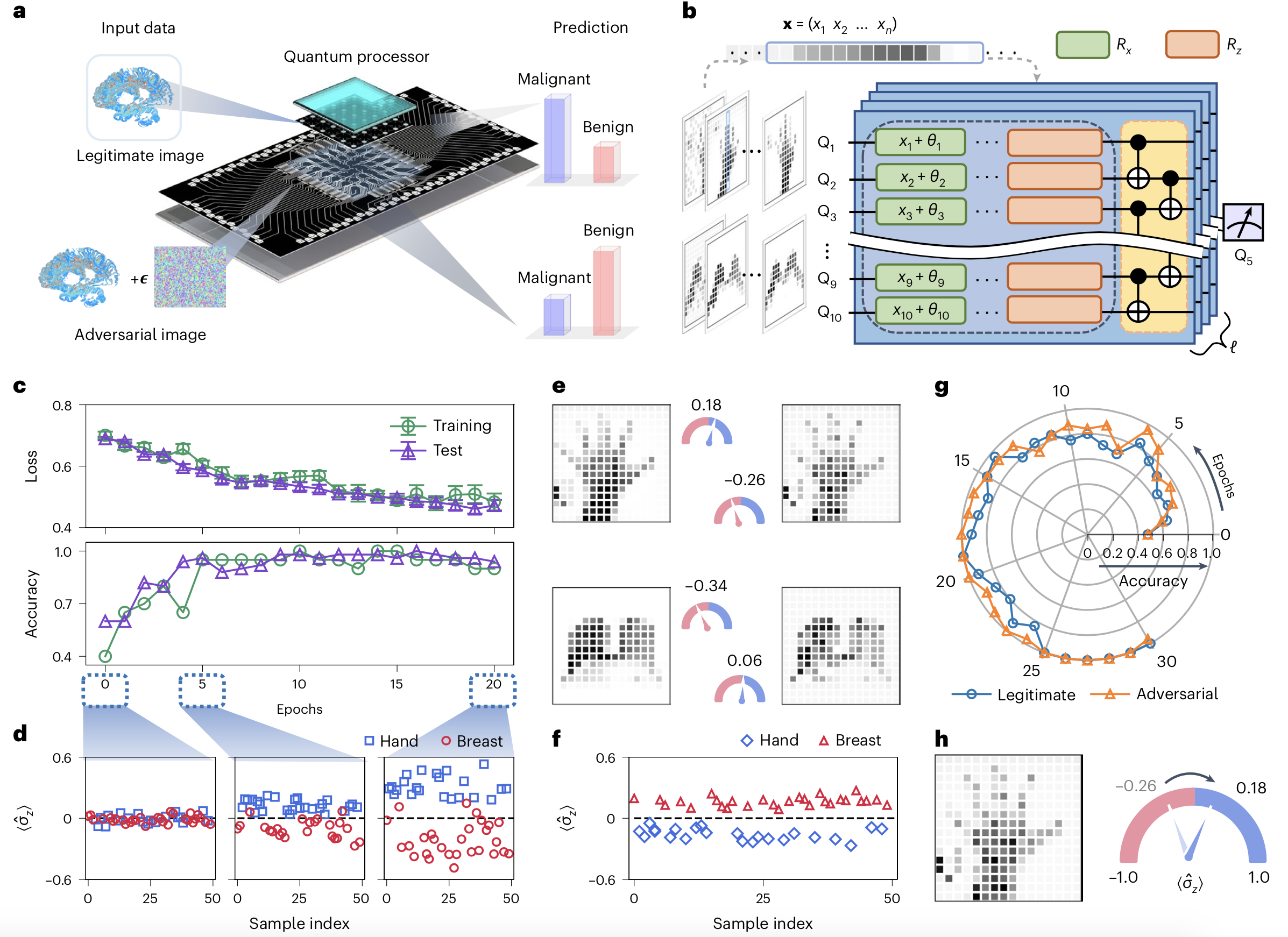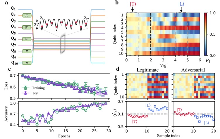 信息研究院邓东灵研究组设计了处理经典数据和量子多体态数据的学习模型,并与浙江大学超导量子计算团队合作,首次在量子设备上成功实现了高维数据的学习、对抗攻击脆弱性的揭示、以及相应防御手段的展示。