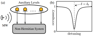 图1:(a)实验系统示意图,其中非厄米系统与辅助能级通过弱微波耦合。原子首先制备在辅助能级上,经过一段时间后测量辅助能级剩余的粒子数。(b)辅助能级占据数随微波失谐变化的典型示例。