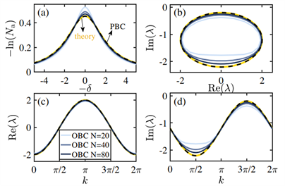 该文章采用主方程与线性响应理论,推导出周期边界条件下动量为k的辅助能级占据数与微波失谐和动量空间本征能量的关系,基于该公式,可以对辅助能级占据数随微波失谐的变化曲线进行拟合得到系统动量空间能谱;同时,该文章证明当系统存在边界时,测量结果随着系统尺寸增大逐渐趋于周期边界下的结果,这意味着对于一个无穷大的系统,测量结果与边界和非厄米趋肤效应无关。该文章进一步基于Hatano-Nelson模型数值验证了这一现象(图2)。