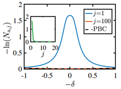该文章还发现若将动量分辨测量改为格点分辨测量,通过测量辅助能级边界处的局域粒子占据数,可以得到系统开边界拓扑零能模式的信息,该信息体现在边界处微波失谐为0时存在一个吸收峰。通过对非厄米Su-Schrieffer-Heeger模型的数值模拟,该文章发现当系统存在零能边界态时,边界处局域占据数在失谐为0时有响应,并且该响应只存在于边界附近(图3),而系统处在拓扑平庸态时则不存在上述响应。