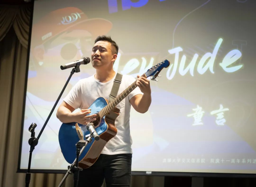 2021级研究生童言背着吉他帅气亮相。作为最后一个出场的达人,完美地将现场观众气氛推至巅峰,完成了精彩的收官。吉他声与他温柔的嗓音融合,向观众们演绎了童言版的《Hey Jude》。整场达人秀的节目部分在全场齐唱NaNaNa~中温馨结束,令人回味无穷。