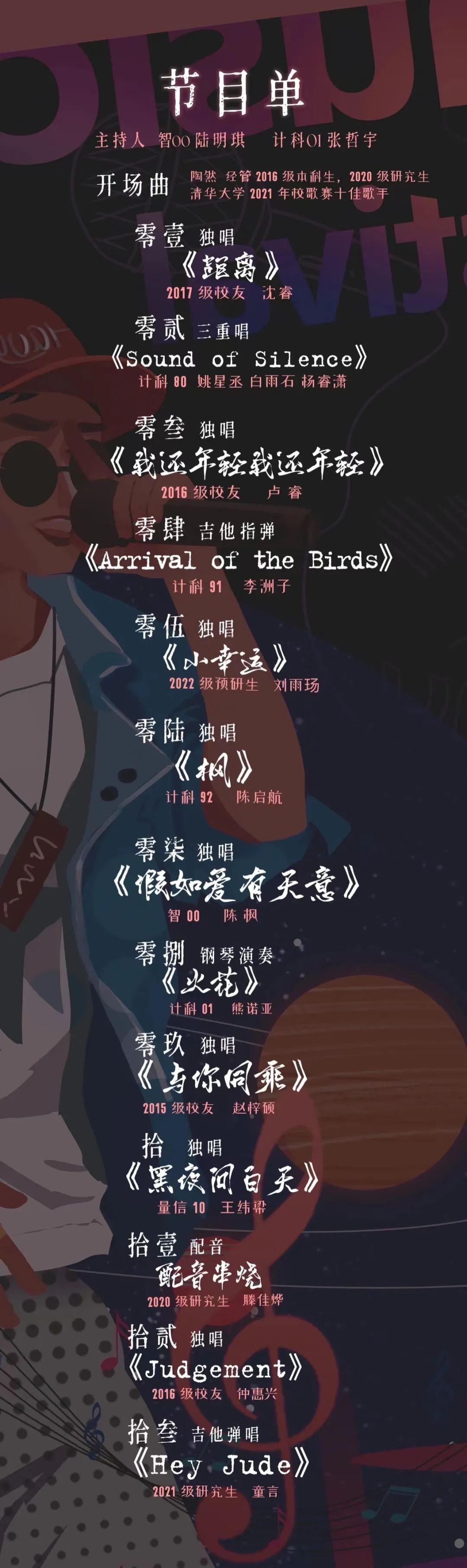 枫,可以作为枫叶,在陈启航的歌声中缓缓飘落。枫,也可以作为一个人的名字。在陈启航深情演绎《枫》之后出场的是来自智00的陈枫。然而很不幸陈枫同学当天生病遗憾未来到现场,于是现场播放了他“躺着”为大家表演的视频。他演绎的《你在最近的天边》充满了技巧和感情,令人动容。