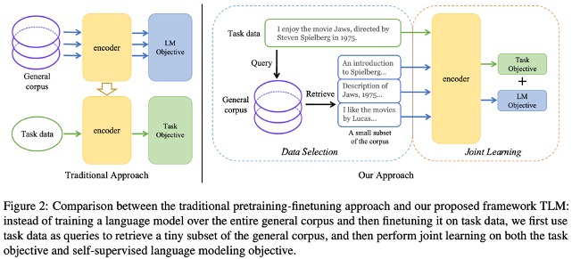 图:新提出的TLM框架与传统的预训练-微调框架的比较