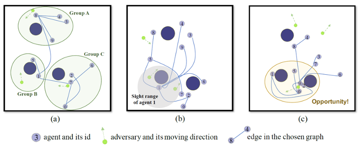 图1:算法在“猎人-猎物”环境中学到的动态协作图
