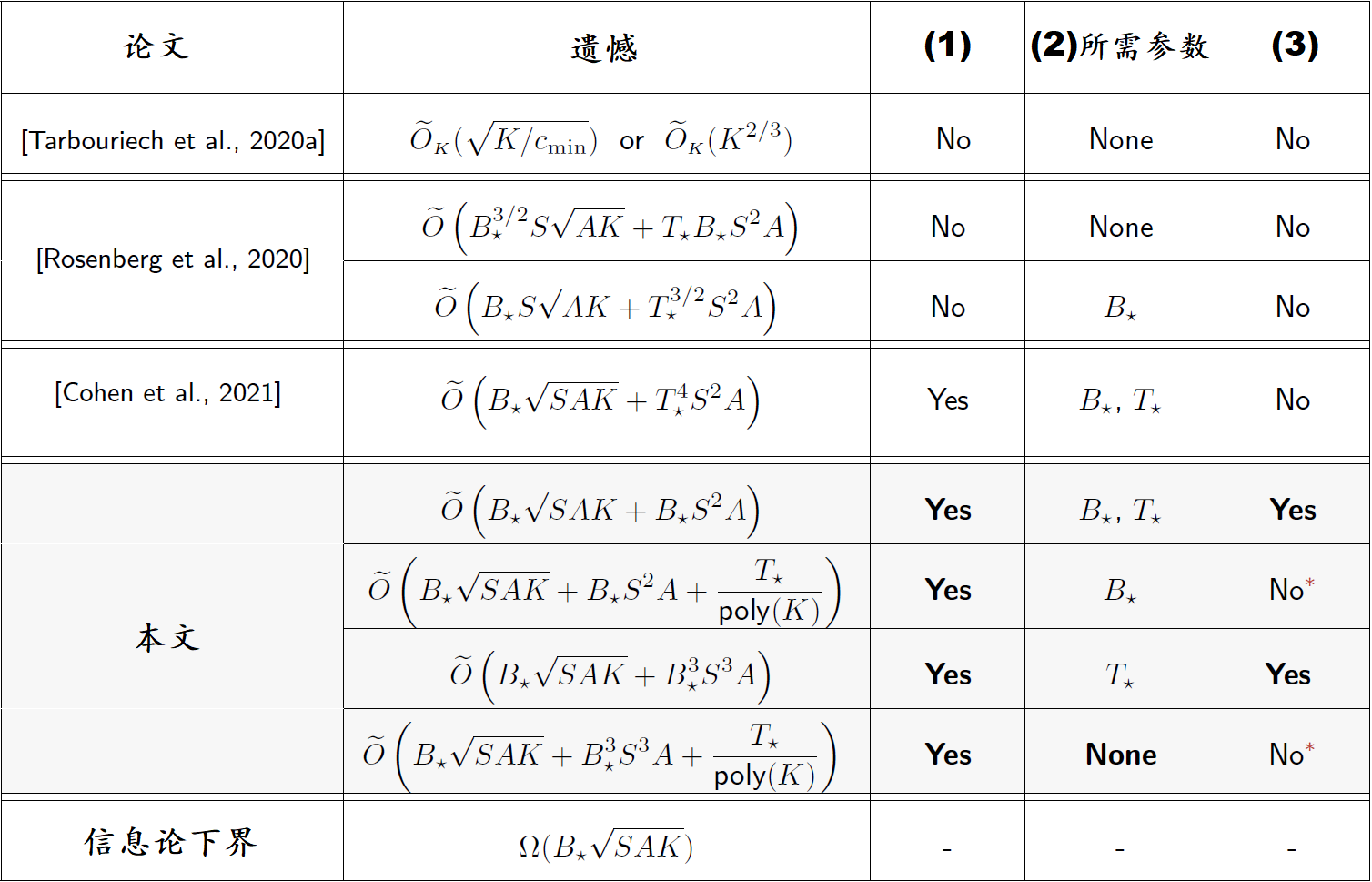 该论文提出了SSP问题的三点要求:(1)最小化最劣情况下的遗憾,由信息论推知下界为Ω(B*√(SAK)),依照理论强化学习惯例,可以忽略对数项和与K无关的项;(2)算法的执行不需要事先知道参数B*和T*,实际情况中人工智能也是不可能知道这两个参数的;(3)忽略对数项后,遗憾与T*无关,因为T*可能会比B*大任意多倍。该论文与另一篇同时投稿的论文分别独立提出了满足要求(1)的不同算法,而该论文的独有贡献在于提出了满足要求(2)的通用算法。最后,该论文中的算法还能以牺牲要求(2)中的T*换取要求(3),而同时满足三点要求的算法是否存在目前仍是开放性问题。