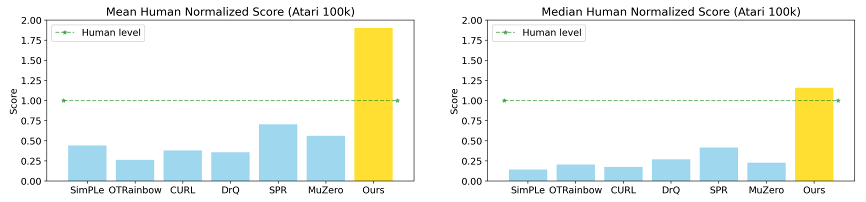 信息研究院高阳研究组在强化学习领域中取得突破,研究组所提出的模型EfficientZero首次在雅达利(Atari )游戏数据上超过同等游戏时长的人类平均水平。EfficientZero的高效率学习能力为强化学习算法应用到现实世界场景提供了更大可能。