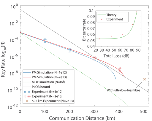 图2 相位匹配量子密钥分发协议(PM-QKD)密钥率与传输距离关系的实验结果。星号的数据点为实验结果,红色和蓝色的实线为相应的数值模拟结果。通过502公里的超损光纤,实验实现了超远距离密钥分发。黑色实线为以前的线性成码上界。