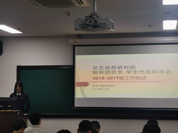 联席会组织部部长张未同学代表第五届姚班联席会做了工作报告。第五届姚班联席会圆满举办了文艺嘉年、北宫森林公园春游、新生团队训练、新生舞会等各项主要活动,同时协助院组建了前往长三角地区的暑期实践支队。此外联席会还举办了学术科研交流沙龙、校庆日校友论坛等具有姚班特色的活动。