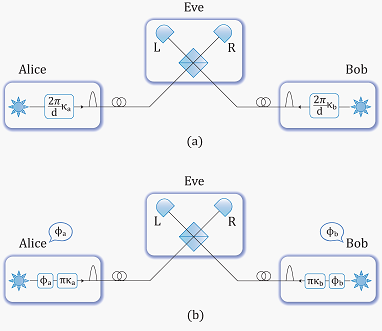 编码到相干态的相位中,然后将衰减后的激光脉冲发送给一个不受信任的测量端Eve。理想情况下,Eve应该进行光子干涉测量并公布结果。这样的干涉测量将匹配Alice和Bob相干光的相位,使得密钥信息