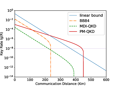 。在光纤量子密钥分发中,由于量子信道通过率随着传输距离的增加而指数衰减,该上界严重限制了量子密钥分发协议在远距离条件下的密钥生成速率。