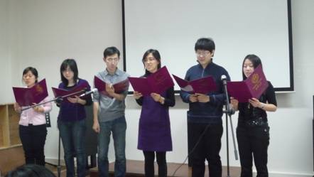 活动现场,计算机系工会全体成员学习并演唱清华大学《老校歌》,并以工会小组为单位组织校园歌曲合唱表演。我院工会成员刘婧、孙迪、常予莹、王艳萍、梁海胜、赵阳合作清唱了《老校歌》,赢得当晚最热烈的掌声。