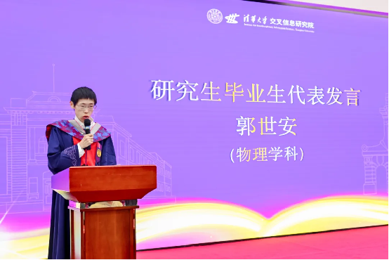 2025届物理学科研究生毕业生代表、清华大学研究生新秀奖得主郭世安在发言中分享了他的成长和科研经历。他表示,面对不可预知的未来,与其孤注一掷地幻想远方,不如立足当下,以静制动,寻找并锚定“不变量”,以不变应万变。他强调,在瞬息万变的世界中,只要接受不确定性,端正态度,坚守本心,我们就能收获独特而多彩的人生。